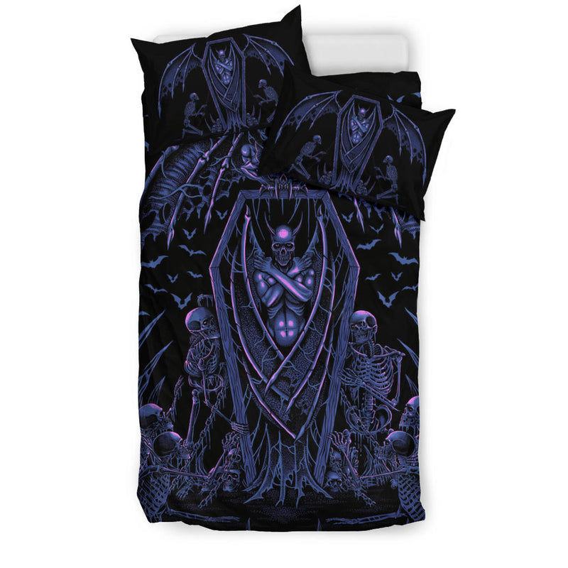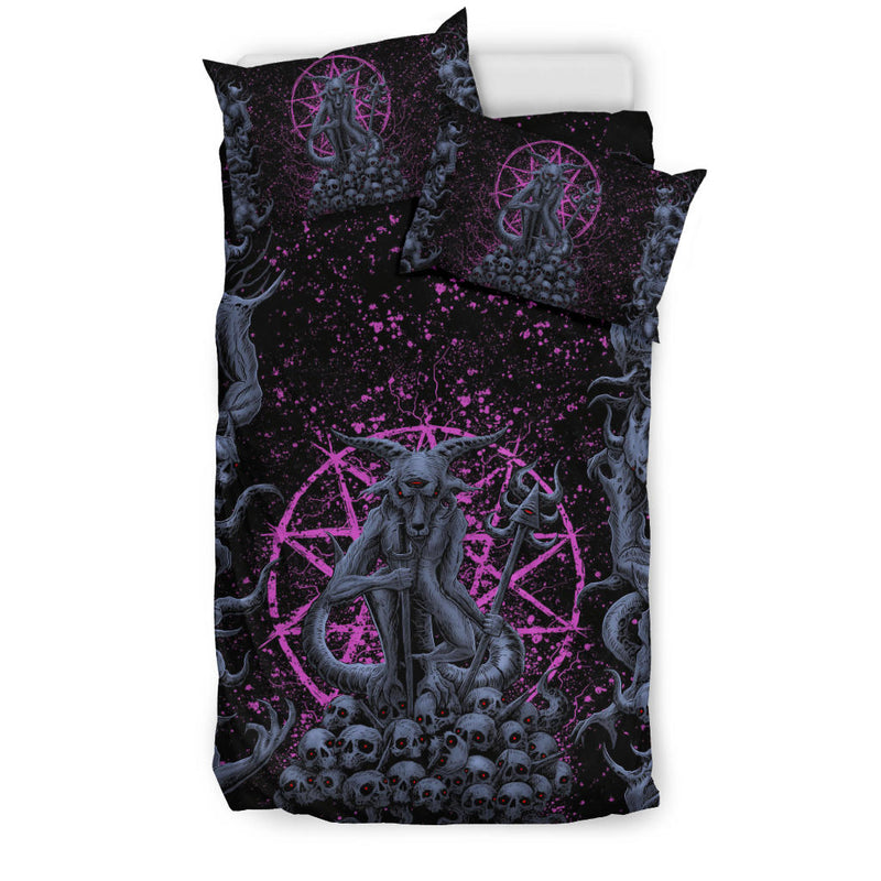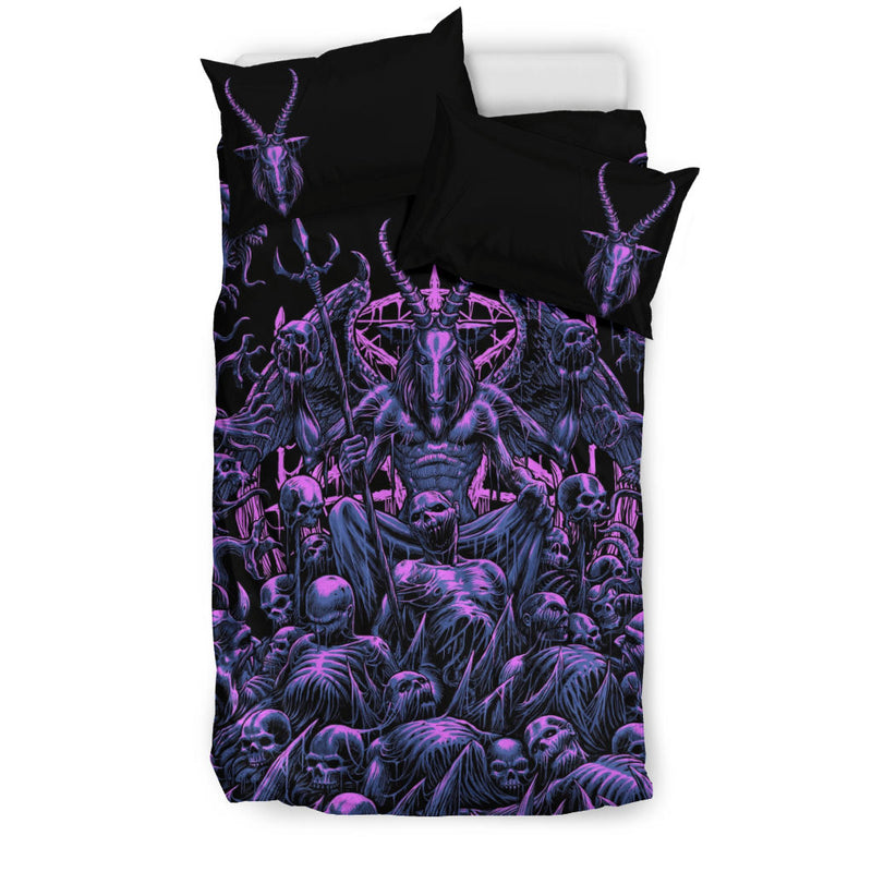 Skull Satanic Pentagram Winged Satanic Goat Demon Zombie Galore Throne 3 Piece Duvet Set Awesome Night Blue Pink