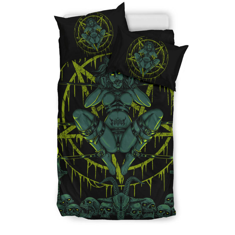 Skull Demon Satanic Baphomet Goat Satanic Pentagram Chaine To Sin And Lovin It 3 Piece Duvet Set Awesome Glowing Green