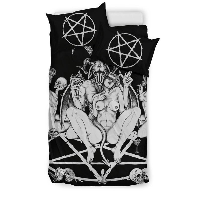 Skull Satanic Baphomet Goat Pentagram Lust God Naughty And Lovin It Cocktail Flesh Party 3 Piece Duvet Set Black And White Awesome Large Print
