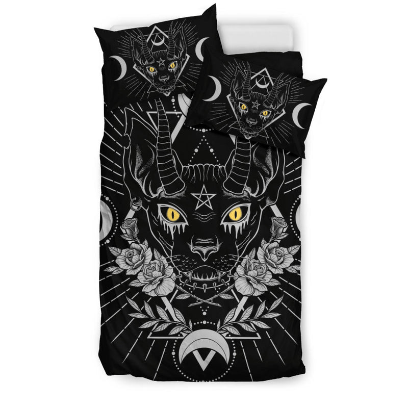Gothic Occult Black Cat Unique Sphinx Style 3 Piece Duvet Set Eye Color Version
