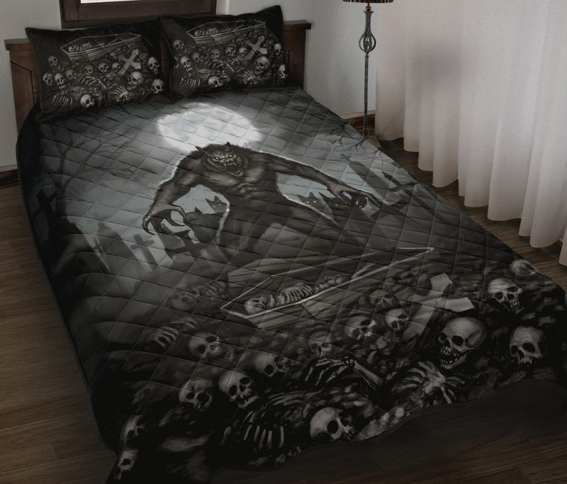 Skull Skeleton Werewolf Pack Creepy Moon light Graveyard Quilt 3 Piece Set