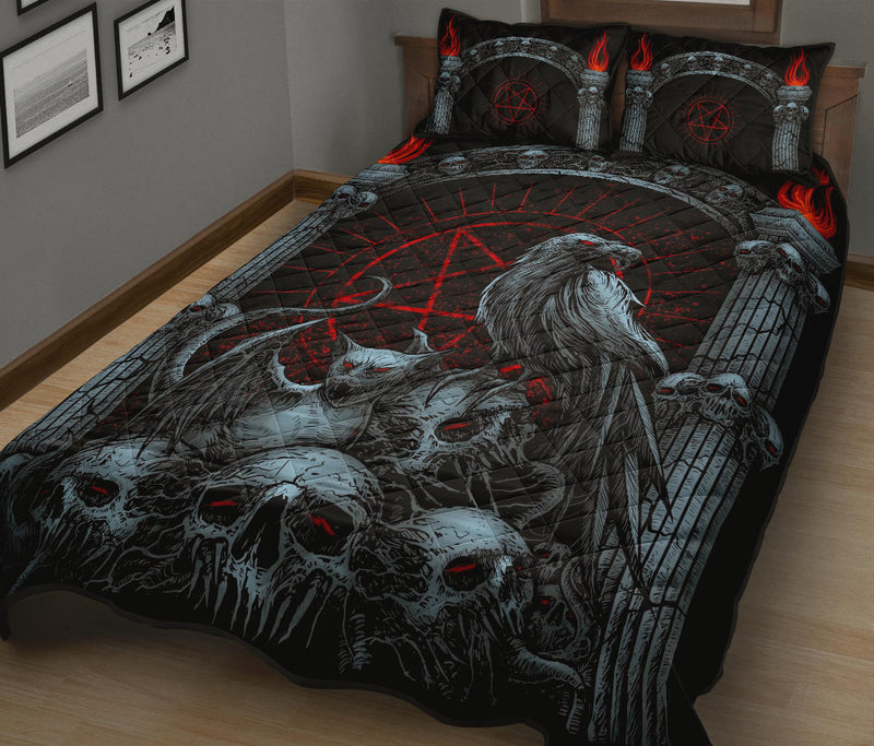 Skull Goth Occult Crow Bat Wing Demon Cat Quilt 3 Piece Set Color Version