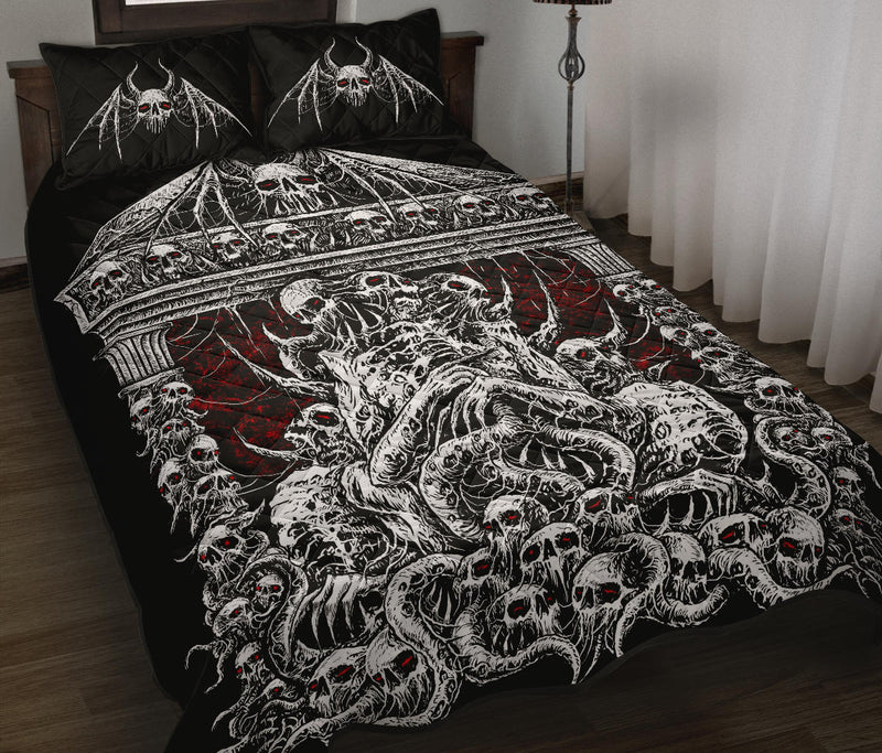 Skull Skeleton Bat Skull Death Shrine Quilt 3 Piece Set Red Background Version