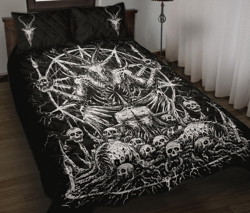 Skull Satanic Goat Impaled Eternal Torment Skull Candle Trophy Quilt All Black And White 3 Piece Set