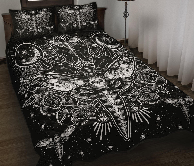Skull Moth Secret Society Occult Style Quilt 3 Piece Set Black And White