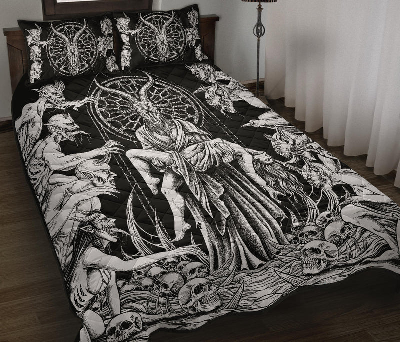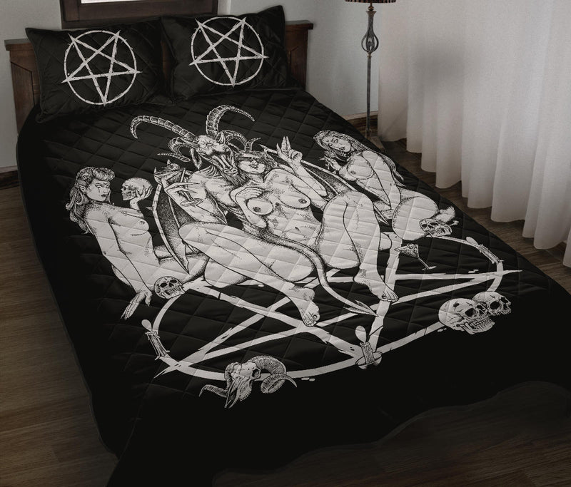 Skull Satanic Baphomet Goat Pentagram Lust God Naughty And Lovin It Cocktail Flesh Party Quilt 3 Piece Set Black And White Awesome Large Print