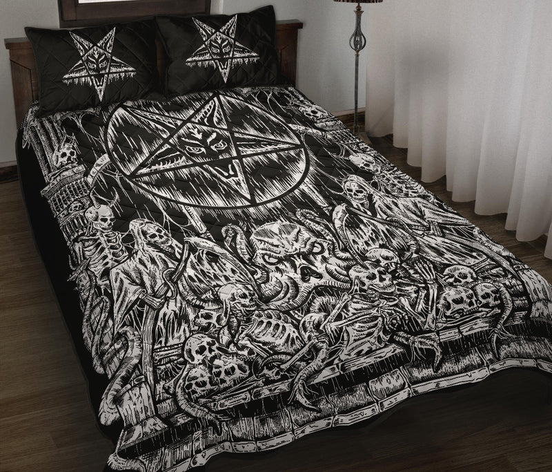 Skull Satanic Goat Impaled Eternal Torment Skull Candle Trophy Quilt All Black And White 3 Piece Set