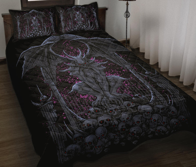 Skull Batwing Gargoyle Demon 3 Piece Quilt Set Night Blue Pink