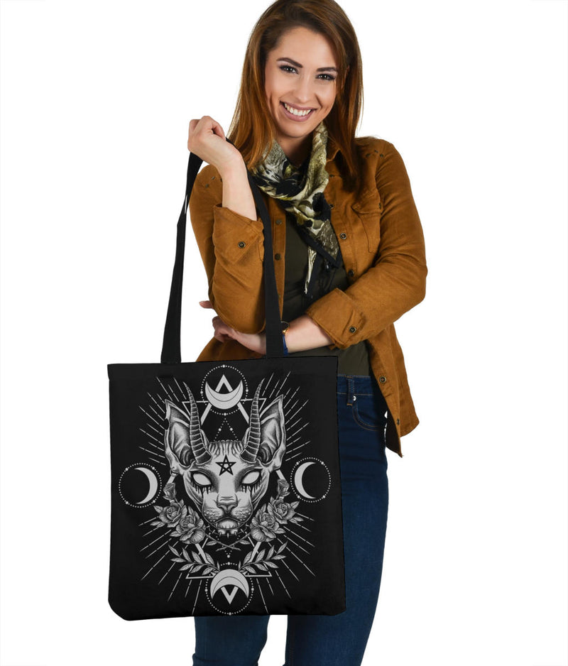 Gothic Occult Black Cat Unique Sphinx Style Large Tote Bag Awesome Demonic White Eye Version