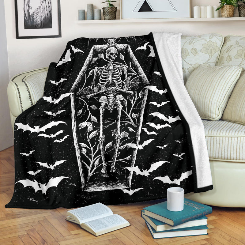 Bat Skull Skeleton Coffin Shrine Blanket Black And White