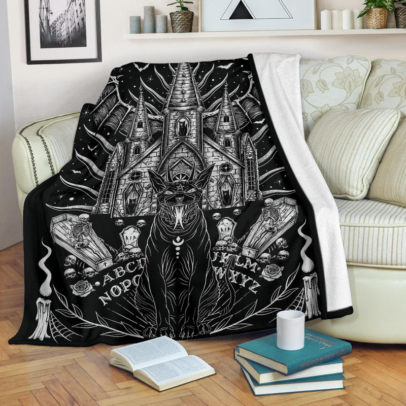 Skull Skeleton Diabolic Cat Coffin Bat Night House Ouija board Style Coffin Window Blanket