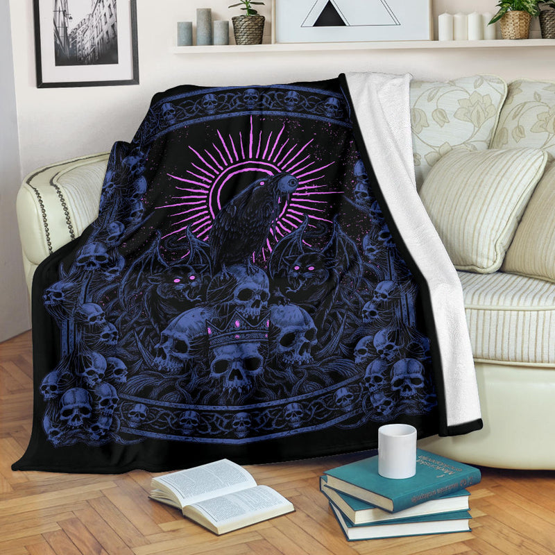 Skull Crown Demon Cat Crow Throne Blanket Night Blue Pink