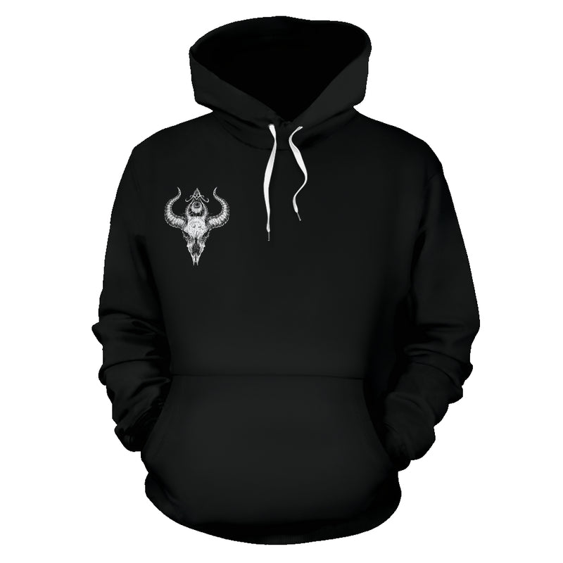 Skull Skeleton Satanic Goat Eternal Impaled Torment Skull Candle Trophy Hoodie Black And White