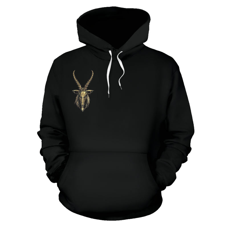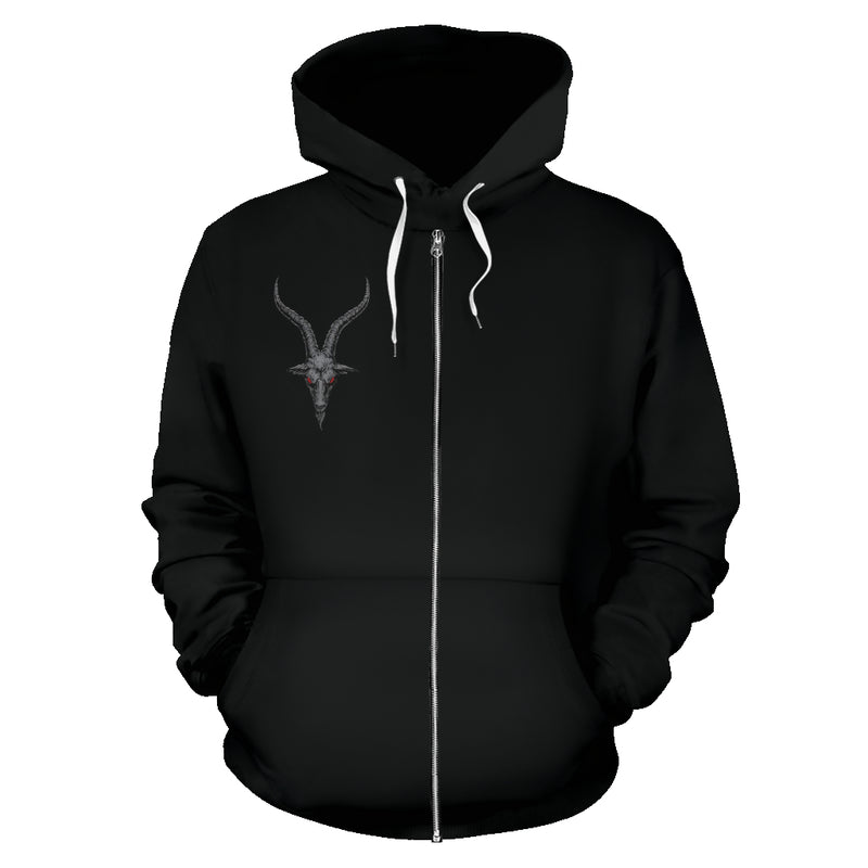 Skull Skeleton Satanic Goat Hoodie With Pentagram Goat Head On Front Original Black And White