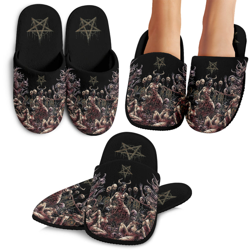Skull Demon Satanic Pentagram Nymphomania And Lovin It Cozy House Slippers Color Version