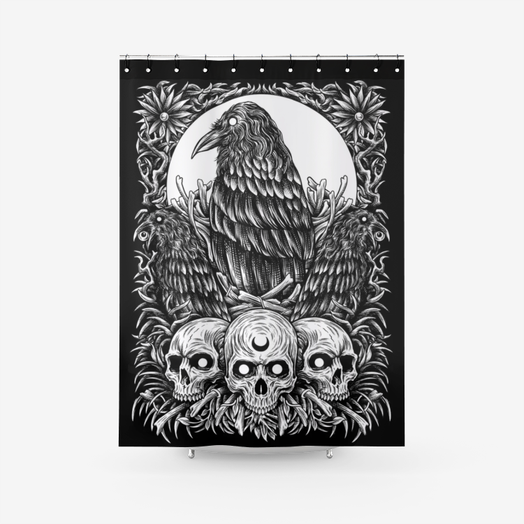 Skull Goth Occult Raven Textured Fabric Shower Curtain Bright White Dark Black