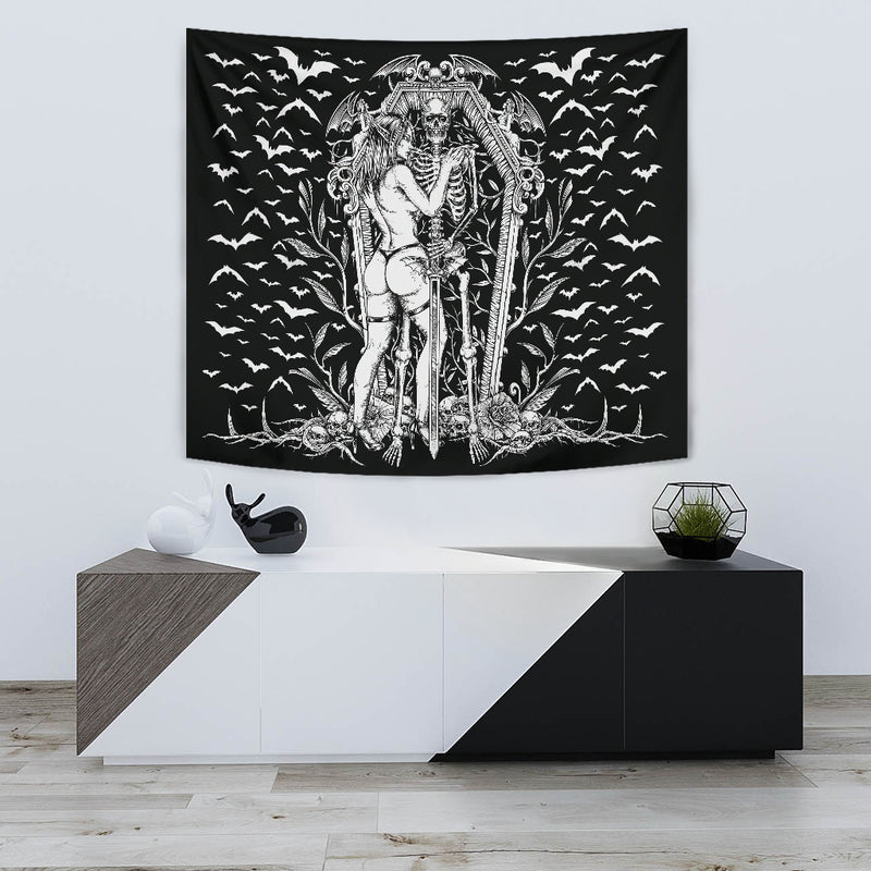 Bat Skull Bat Wing Erotic Demonic Skeleton Coffin Shrine Large Wall Decoration Tapestry Black And White