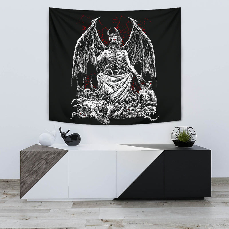 Skull Skeleton Winged Satanic Demon God Large Wall Tapestry Black And White Red