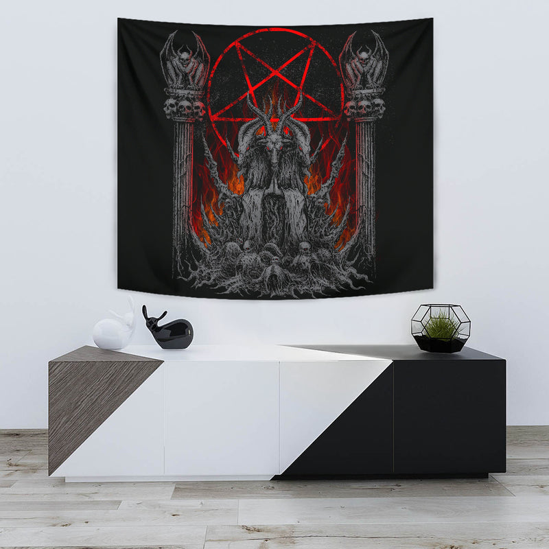 Skull Satanic Goat Satanic Pentagram Shrine Large Tapestry Black And White