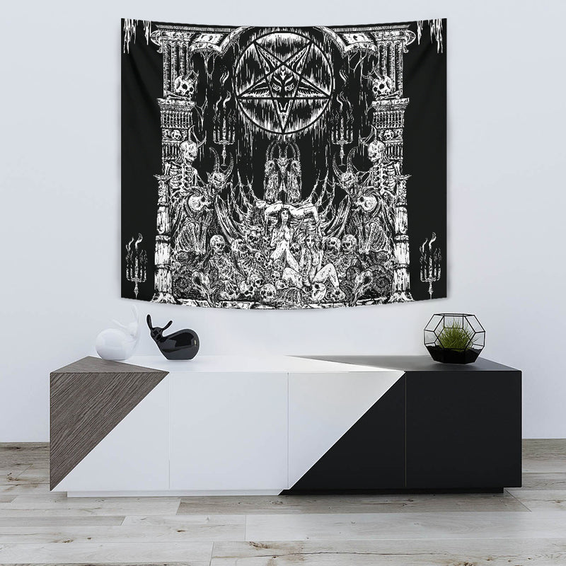 Skull Satanic Baphomet Goat Pentagram Lust God Naughty And Lovin It Cocktail Flesh Party Large Wall Decoration Tapestry Black And White