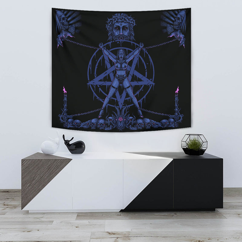 Skull Satanic Pentagram Demon Chained To Sin And Lovin It Part 2 - Large Wall Decoration Tapestry Erotic Blue Pink