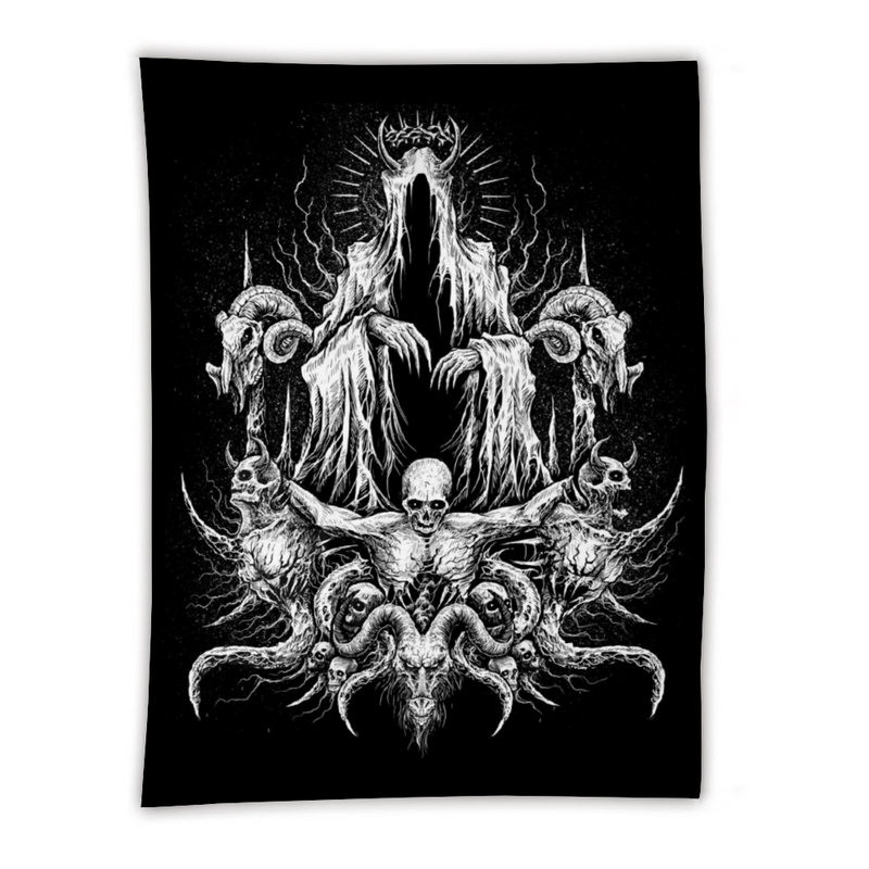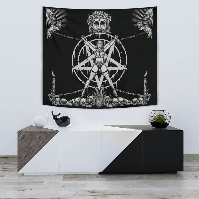 Skull Satanic Goat Demon Impaled and Crucified Tapestry Black And White 59" × 79''